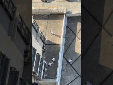 一名身穿防疫服的工作人员在天台上处理一具疑似坠亡的尸体,不远处地面上还有一具